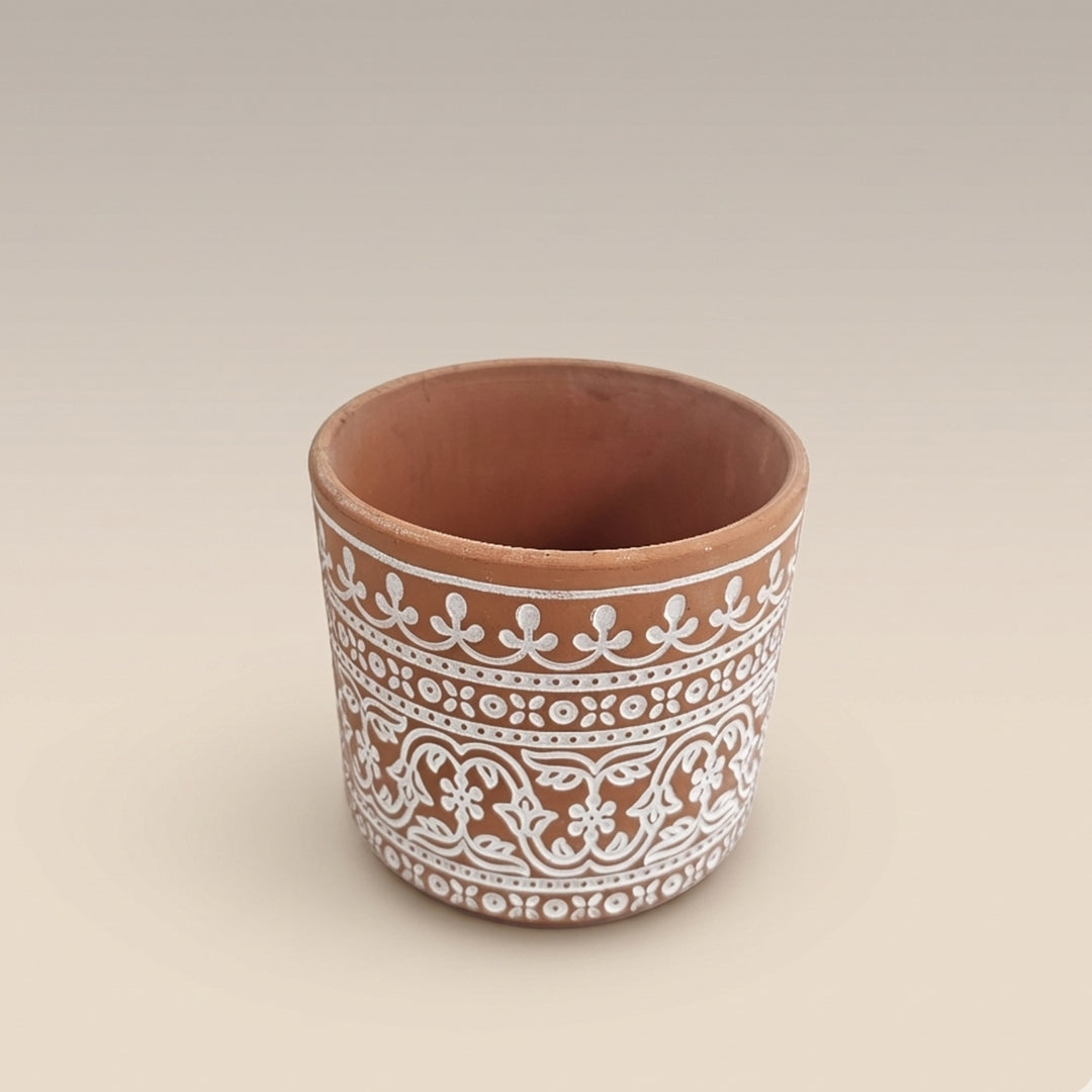 Ceramic Hand-Painted Terracotta with Traditional White Motif Pot - Indoor-outdoor Planter