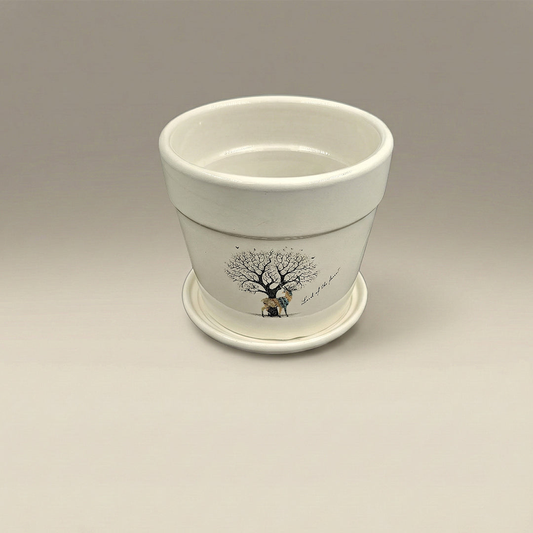 Ceramic Tree Printed Bucket Shaped Pot with saucer - Indoor-outdoor Planter