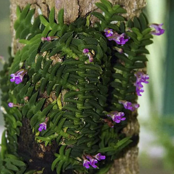Add a rare and visually striking miniature orchid to your collection with Schoenorchis scolopendria, known for its densely packed foliage and charming, tiny purple-pink blooms. This epiphytic orchid thrives in humid environments and is perfect for mounting, making it a favorite among bonsai and terrarium enthusiasts.