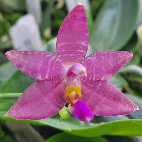 A compact and potentially striking hybrid, combining the small stature of Phalaenopsis Minus with the deep coloration of Phalaenopsis Indigo Blue.